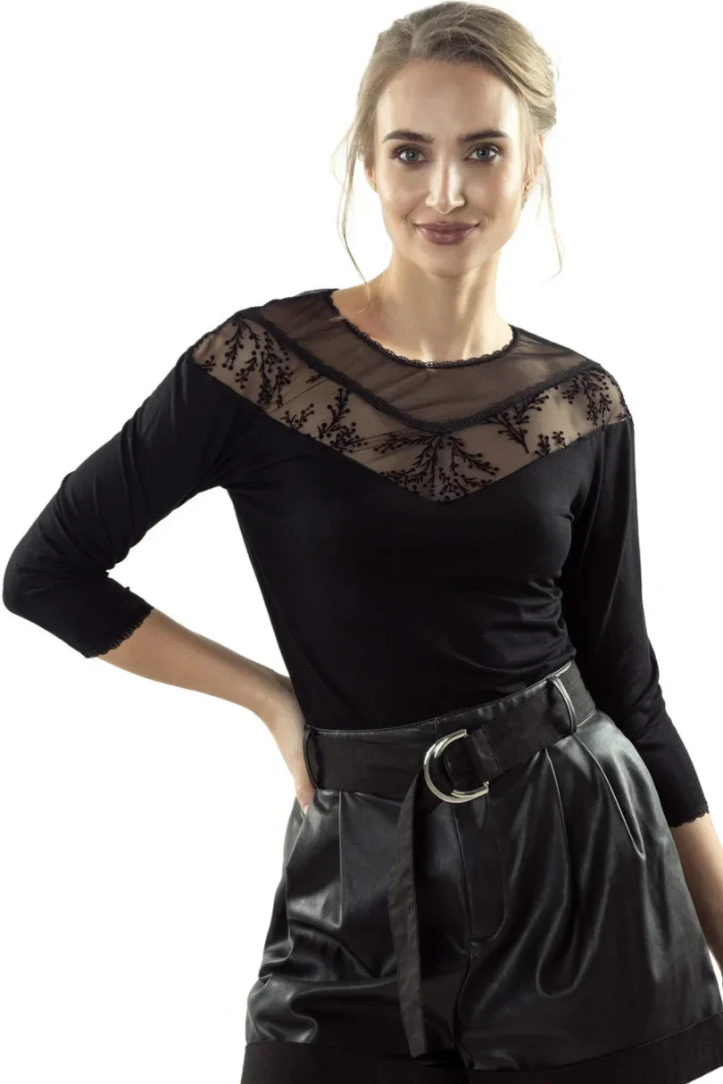 Klasická halenka s průhledným véčkovým výstřihem přesahujícím na ramena a záda. Zapínání na knoflíky na zadní straně. 3/4 rukávy zakončené jemnou krajkou.
