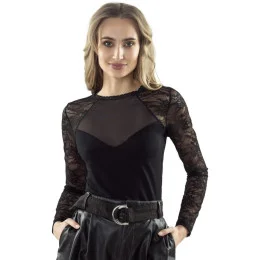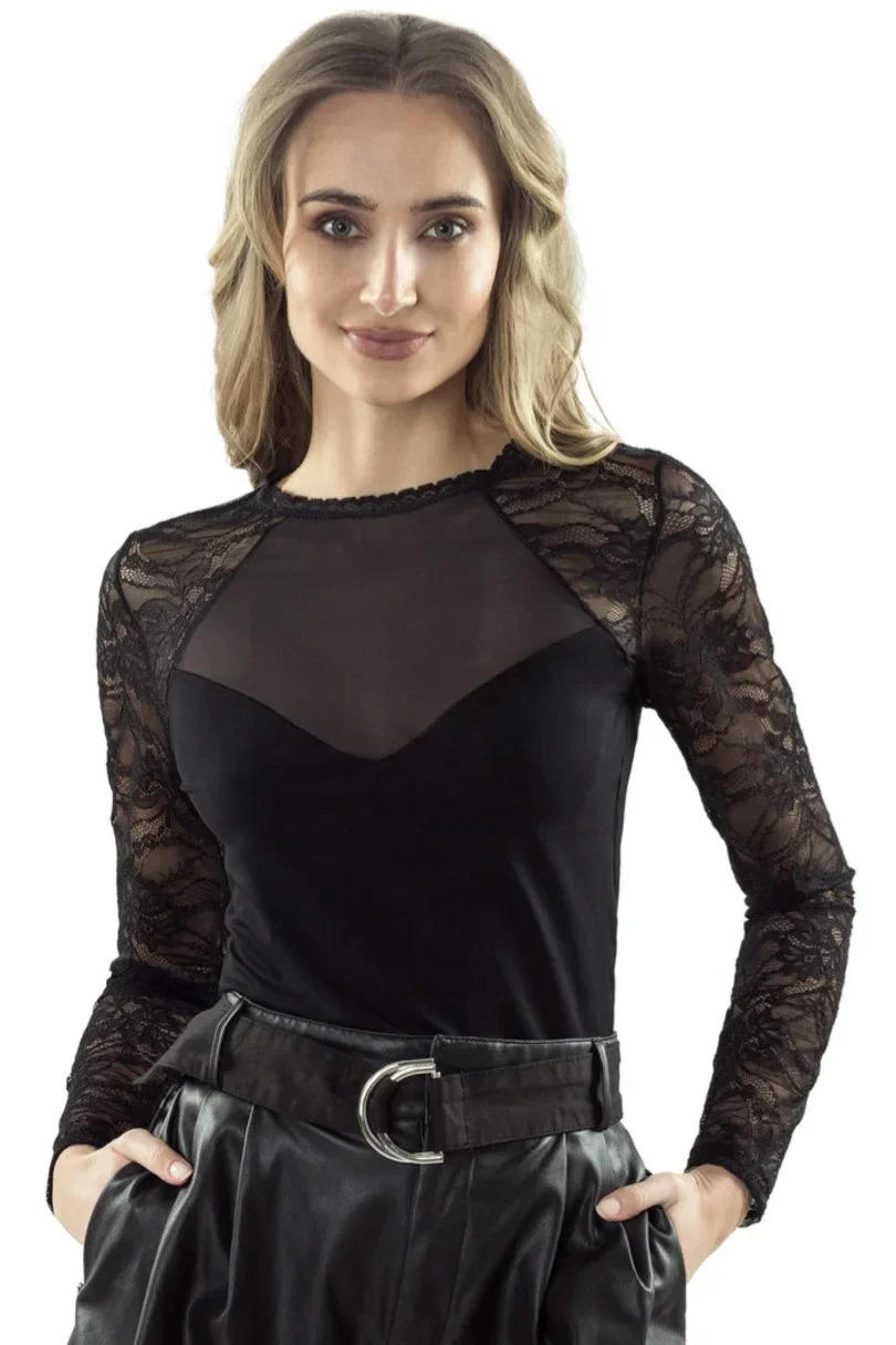 Přiléhavá halenka s rukávy a zadním gór z husté krajky. Tylové vsadky ve výstřihu.