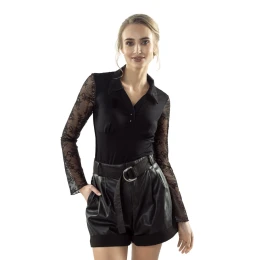 Elegantní halenka s límečkem z viskózy a krajky. Krajkové rukávy a límec. Zapíná se vpředu na dva knoflíky. Řasení pro zvýraznění poprsí.