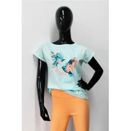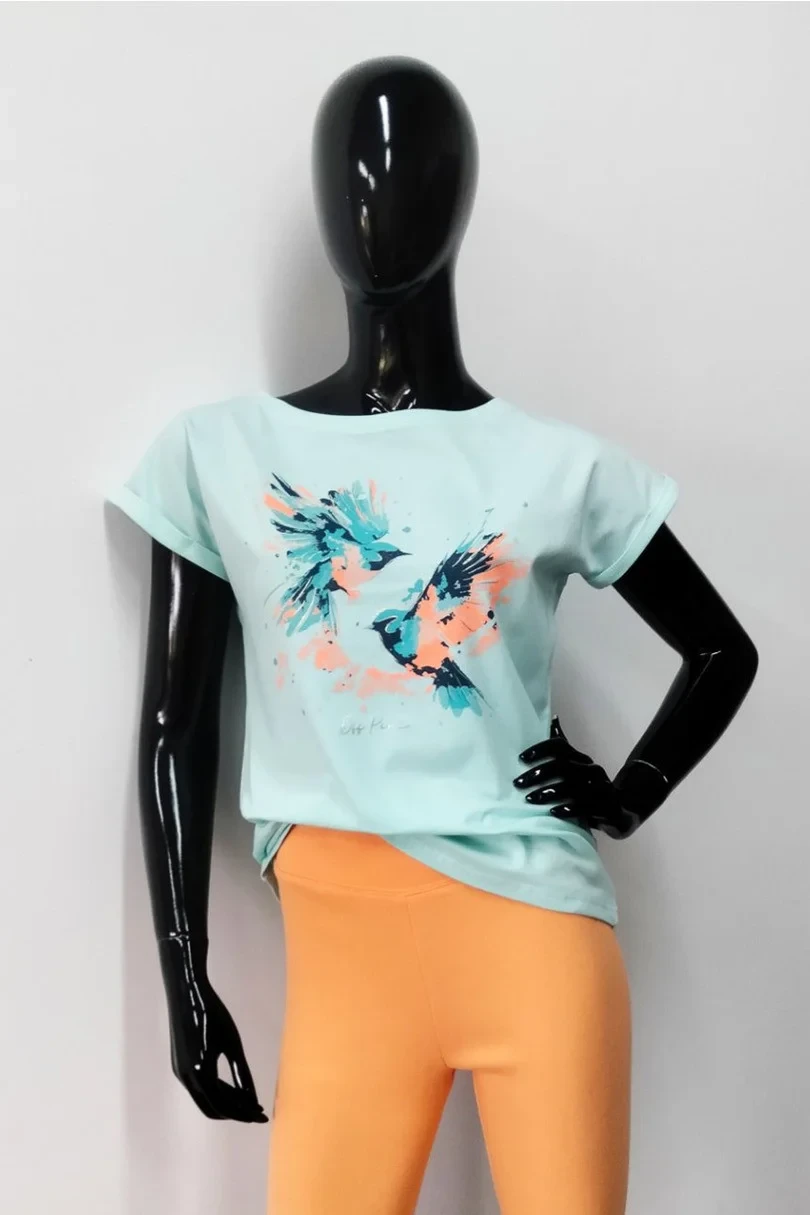 Dámská halenka s krátkými rukávy zakončenými ohrnutím. Zdobí ji barevný potisk s lesklými prvky. Rovný střih s kulatým výstřihem. Tričko je vyrobeno z bavlny s přídavkem elastanu.