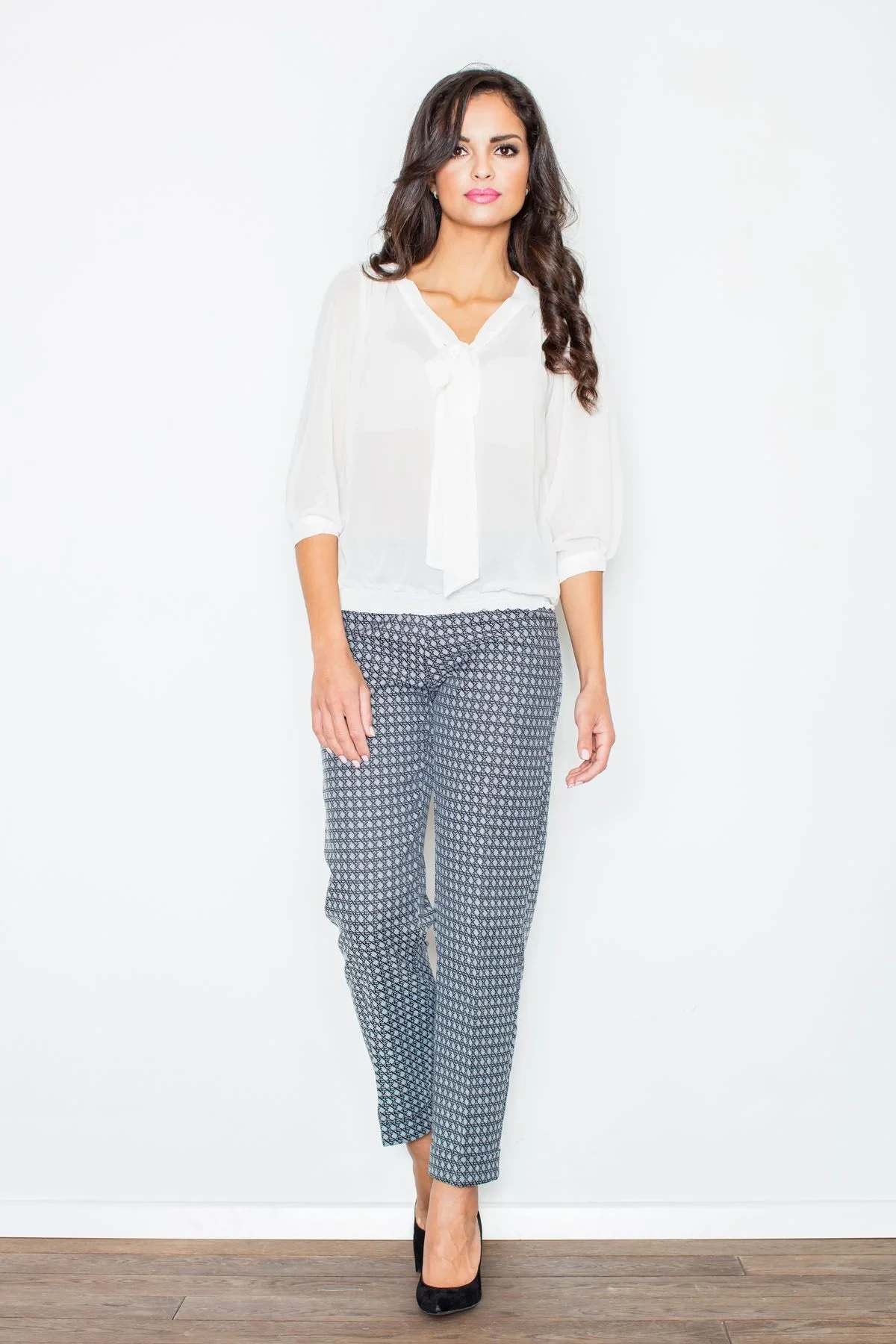 Sexy halenka s motýlkem z jemného šifonu, vzdušná a poloprůsvitná, lákavá od prvního pohledu. Skvěle se hodí na výjimečný večer, v kombinaci s kalhotami vytvoří zajímavý, elegantní vzhled. 3/4 rukávy se zapínáním na knoflíky, módní ramenní buffety, nápadný výstřih a žebrovaný lem. 100% polyester.