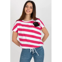 Dámská halenka s krátkými rukávy a kulatým výstřihem v barevných pruzích. Ozdobná brož ve tvaru květiny na přední straně.