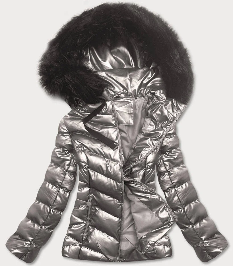 Stříbrná lesklá dámská zimní bunda s kapucí (5m773-401)