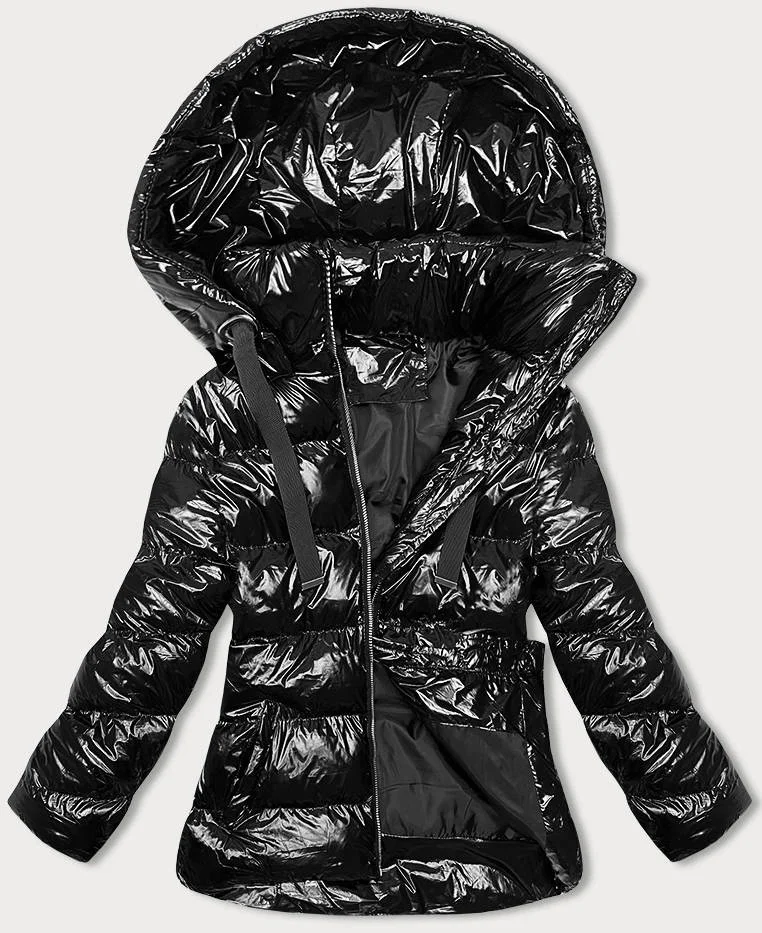 Lesklá černá dámská bunda s kapucí (5M3172-392)