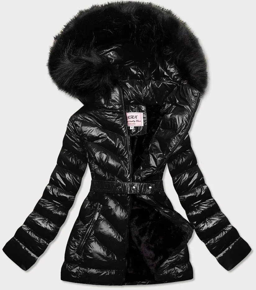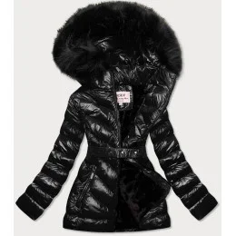 Černá lesklá zimní bunda s mechovitou kožešinovou podšívkou (w673)