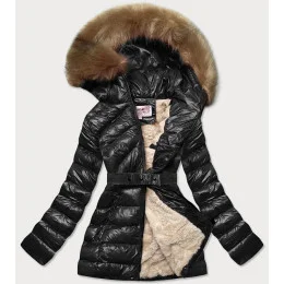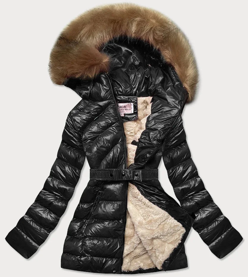 Černo-béžová lesklá zimní bunda s mechovitou kožešinovou podšívkou (w674)