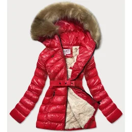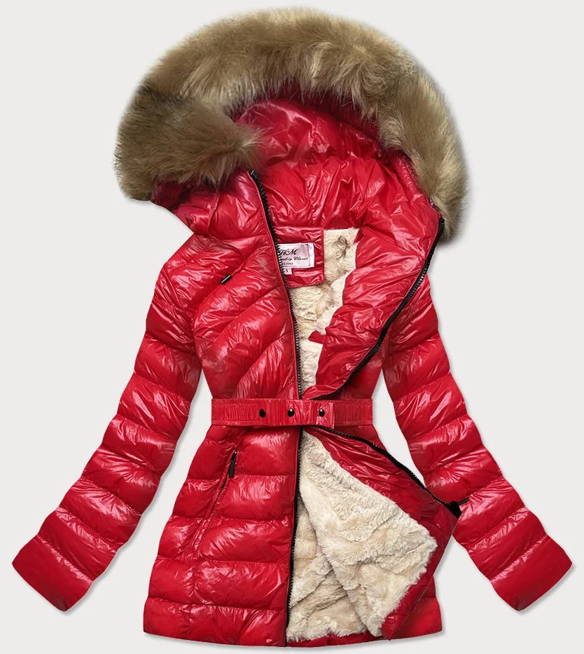Červená lesklá zimní bunda s mechovitou kožešinovou podšívkou (w674)