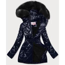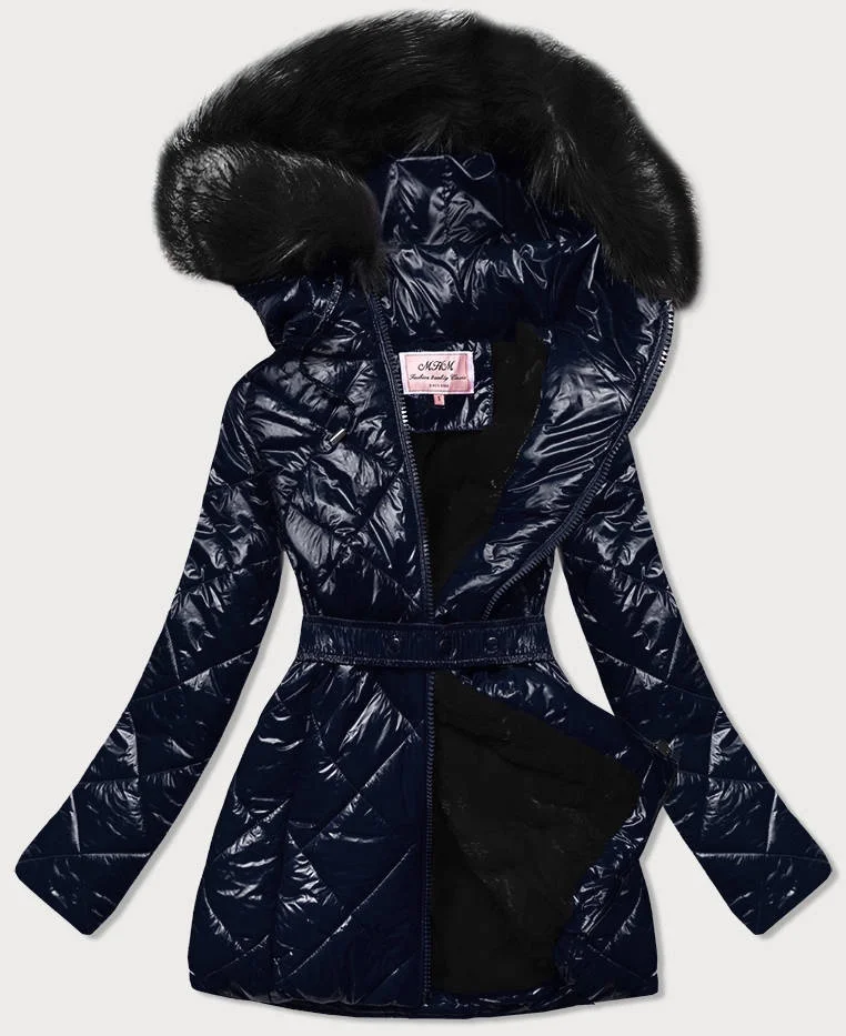 Tmavě modrá lesklá zimní bunda s mechovitou kožešinovou podšívkou (w756)