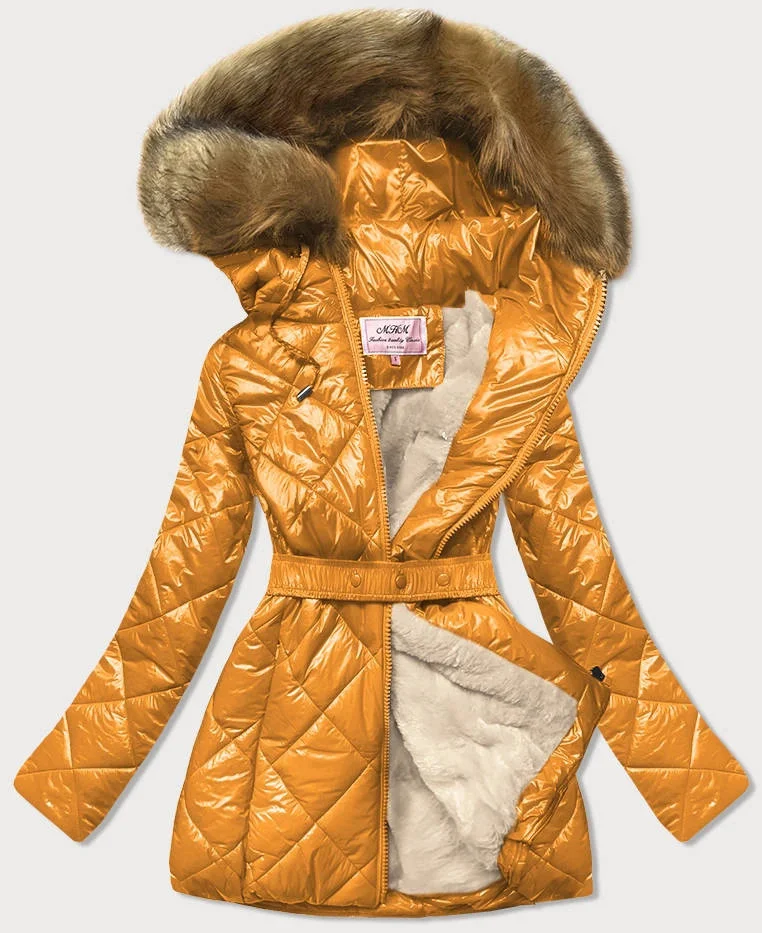 Žlutá lesklá zimní bunda s mechovitou kožešinou podšívkou (w756)