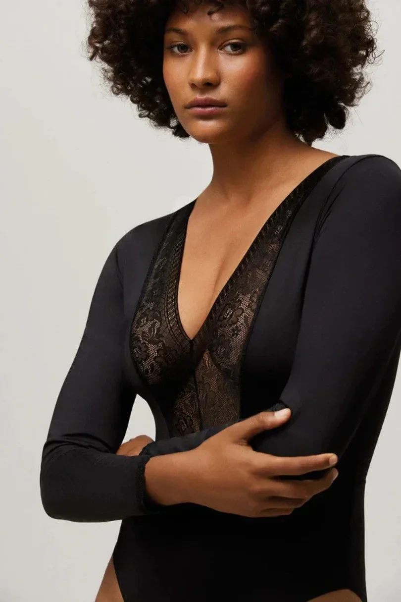 Body s dlouhými rukávy a květinovou krajkou. Ženský a smyslný živůtek.