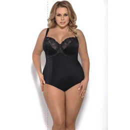 Eleganckie, bardzo wygodne body dla pań z większym biustem, lubiących czuć się komfortowo. Wykonane z microfibry o wysokiej gramaturze, na przodzie i bokach dodatkowo, od spodu, wzmocnionej siateczką - wspaniale modeluje sylwetkę ciała. Pionowe przeszycia z przodu pięknie podkreślają linię talii. Posiada miękkie miseczki, których dolne części wykonane są z gładkiej, stabilnej dzianiny, która zapewnia idealnie zbieranie biustu z boków do środka i utrzymanie go we właściwym miejscu. Górne miski tego body wykonane są z uroczego haftu dodatkowo od spodu wzmocnionego mięciutką siateczką. Pomiędzy miseczkami i pod nimi piękne wstawki z haftu – całość ozdobiona małą kokardką z biżuterią. Miseczki wyprofilowane są drutem okalającym piersi - całość sprawia, że piersi są idealnie zebrane do środka, podniesione i utrzymują piękny, zaokrąglony kształt, a środek dokładnie przylega do