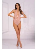 Smyslné, plné krajkové body v krásné pastelové barvě. Měkké a pružné. Návrh, který mimořádně žensky zdobí tělo. Střih s vysokým vykrojením na stehnech, díky němuž nohy vypadají delší. Výstřih s motýlkem. Zadní díl z průhledného tylu. Zavazování za krkem. Bez zapínání v rozkroku. Složení: 90 % polyamid, 10 % elastan.