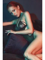 Fenomenální, mega sexy černé body z elastického tylu a zajímavě vyšívané krajky. Model s výřezy na bocích, s pásky na zádech a na hýždích, který vyzařuje sex-appeal. Měkká a průhledná tkanina. Měkká střecha, bez spodního vedení. Nastavitelné popruhy.