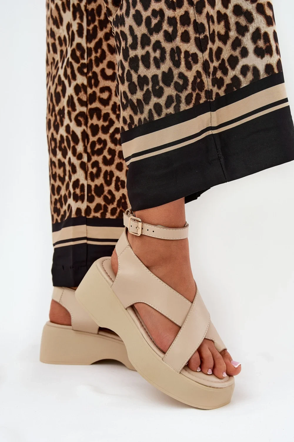 Dámské sandály z ekokože, umístěné na platformě a jemném klínku, které spojují pohodlí s módním vzhledem. Zapínají se kolem kotníku na sponu s nastavitelným popruhem, což umožňuje ideální přizpůsobení noze. Měkká stélka zajišťuje pohodlí po celý den. Ideální na teplé dny, tyto sandály skvěle ladí s šaty, sukněmi a kalhotami, dodávají každému outfitu lehkost.