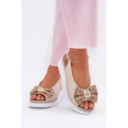 Dámské sandály z přírodní kůže na klínové podrážce jsou elegantní a pohodlnou volbou na letní dny. Zapínají se na přezku s nastavitelným páskem, což zajišťuje skvělé přizpůsobení noze. Na přední straně mají roztomilou mašli s zlatým detailem, která jim dodává jemný šarm. Skvěle se hodí k šatům, sukním nebo kalhotám, spojují pohodlí s módním vzhledem. Ideální na každodenní nošení i speciální příležitosti.
