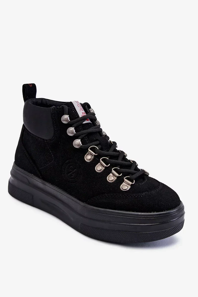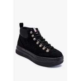 Holínky ve stylu Trapper jsou ideální pro chladnější dny! Byly vyrobeny z kombinace imitace semiše a syntetického materiálu. Mají klasické šněrování s kulatými tkaničkami. Model s dodatečně vyztuženou patou. Turistické boty jsou namontovány na silné masivní platformě. Ideální pro podzimní stylizace. Musíte je mít! Při výběru velikosti použijte tabulku velikostí.