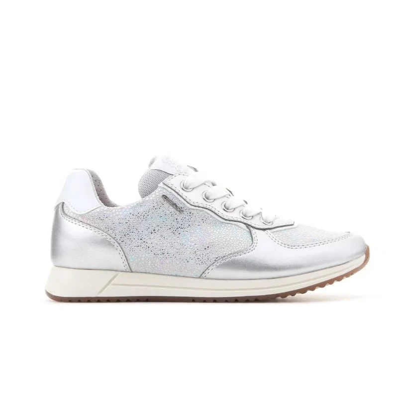 - Stříbrný šněrovací svršek má vsadky se stříbrnými třpytkami.