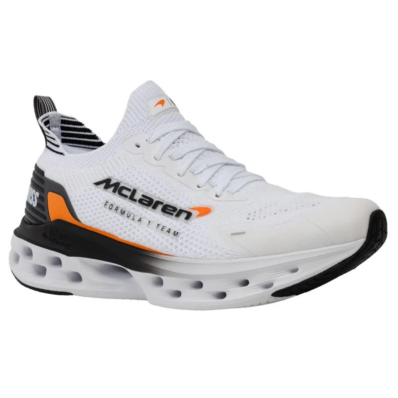 - Barevné schéma: Kombinace bílé, černé a výrazné papáje inspirované barvami značky McLaren dodává obuvi dynamický a sportovní vzhled.