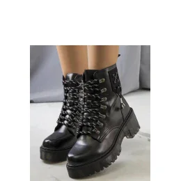 Černé kotníkové boty Laverda s ozdobným šněrováním jsou naprostým hitem této sezóny! Jejich vysoká podrážka přidává botám charakter a dělá je velmi stylovými. Vyrobené z vysoké kvality materiálů, zajistí nejen módní vzhled, ale také pohodlí při nošení. Ozdobné šněrování umožňuje přizpůsobit svršek noze, a teplé vnitřní s potiskem kříže zaručuje příjemné teplo v chladné dny. Standardní numerace usnadňuje výběr správné velikosti. Ideální na podzim a zimu!