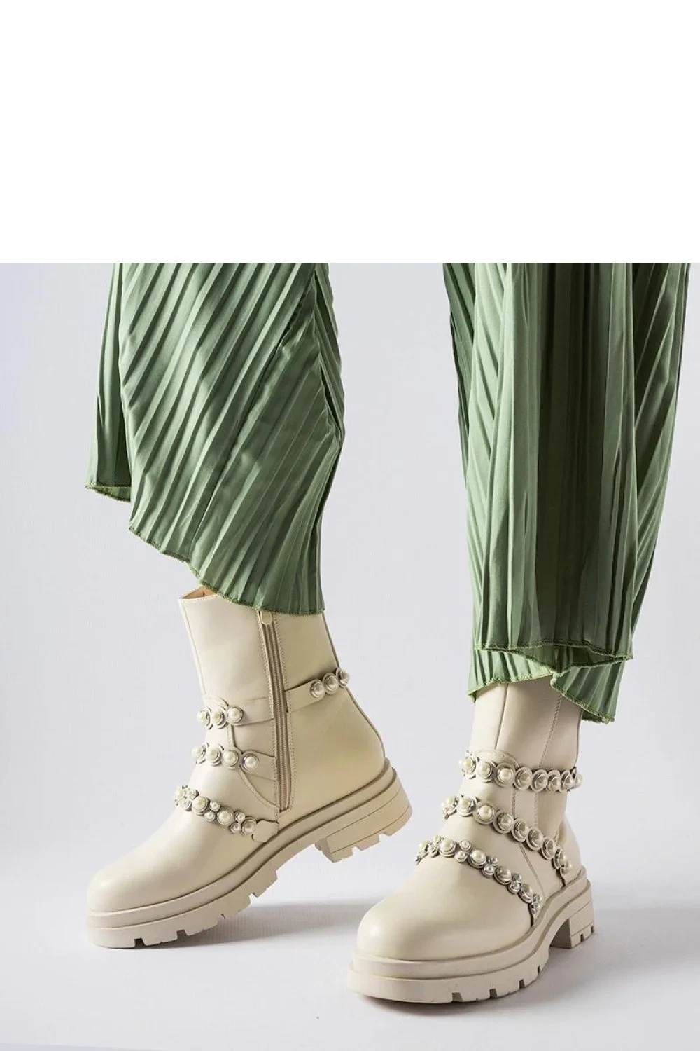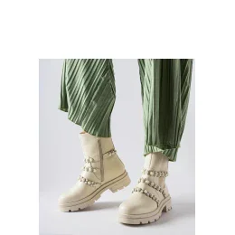 Béžové botky zdobené perlami Callicratide jsou elegantní a stylová obuv, která určitě přitáhne pozornost. Mají kulatou špičku a praktické zapínání na zip, co zajišťuje pohodlí při nošení. Vyrobené z vysoce kvalitní ekologické kůže, tyto botky jsou skvělou volbou na chladné dny. Jejich plochý podpatek zaručuje stabilitu a pohodlí při nošení po celý den. Navíc jemné zdobení perlami jim dodává jedinečný šarm a eleganci. Tyto botky budou skvělým doplňkem mnoha outfitů, přidávají jim trochu luxusu a elegance. Ideální na podzim a zimu, kdy chceme vypadat stylově a pohodlně zároveň.