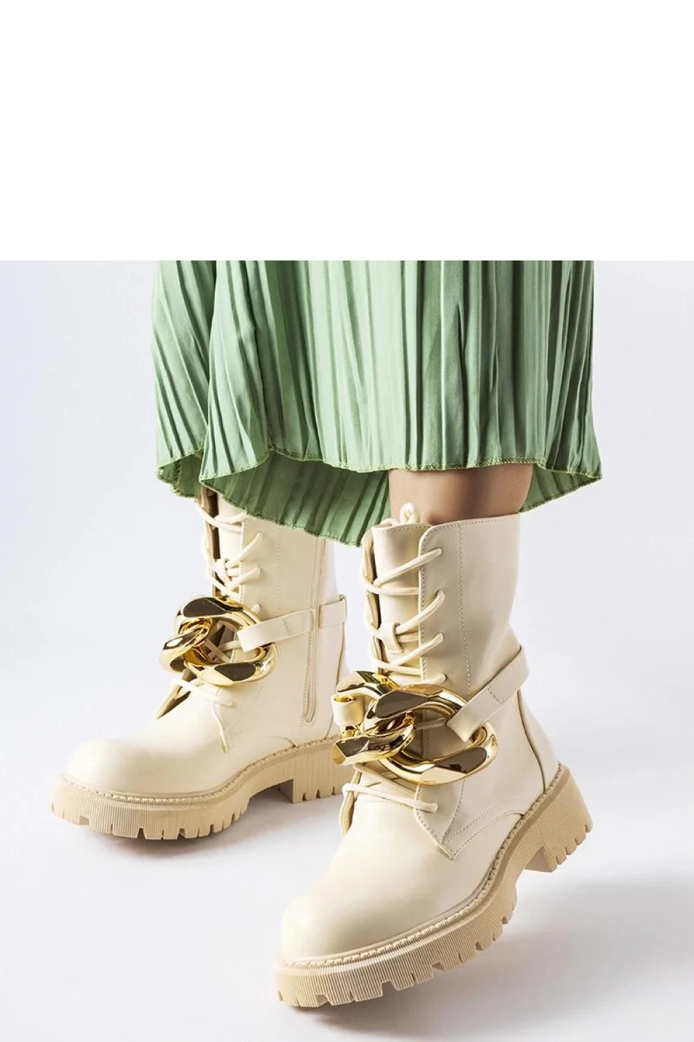 Béžové trapery s řetízkem Galar jsou naprostým hitem této sezóny! Tento model kombinuje všechny nejmodernější trendy. Svršek je vyroben z kvalitní ekologické kůže, což zaručuje pohodlné nošení. Zlaté detaily dodávají botám eleganci a styl. Velikostní škála je standardní, takže se vyplatí držet svou běžnou velikost. Trapery nemají žádné zateplení a podrážka je vyrobena z odolné gumy v béžové barvě. Ideální boty na podzim a zimu!