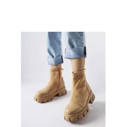 Béžové tašky Milo z ekokůže s prošlapaným povrchem jsou ideální volbou pro každou příležitost. Jejich vysoký svršek jim dodává charakter a platforma je mírně zvedá nad zem pro pohodlí a stabilitu při chůzi. Střední podpatek zajišťuje dobrou přilnavost na různých površích, takže je můžete nosit, ať už se procházíte po městě, nebo na výletě do lesa či na hory. Kulatá špička a ozdobný zip dodávají botám klasický vzhled, který se hodí k mnoha stylům. Měkký vnitřní materiál a pružná guma v podrážce zajišťují pohodlné nošení po celý den. Tyto stylové a praktické bagery budou dokonalým doplňkem vašeho šatníku na podzim a jaro.