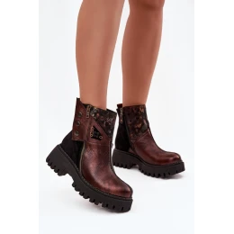 Dámské kotníkové boty značky Maciejka, vyrobené z vysoké kvality přírodní kůže, jsou kombinací stylu a pohodlí. Umístěné na platformě a plochém podpatku poskytují pohodlí během nošení. Model se vyznačuje jedinečným svrškem s efektním vzorem, zapínáním na patentky a zipem, co dodává originální charakter. Uvnitř jsou vyloženy kožíškem. Ideální pro podzimně-zimní stylizace, spojují trendy design s funkcionalitou.