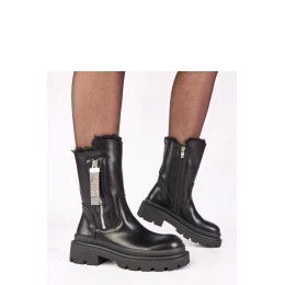 Elegantní kotníkové boty vyrobené z vysoce kvalitní ekologické kůže, které kombinují klasický střih s efektními detaily. Model se vyznačuje ozdobným vnějším zipem s cirkonii, který botám dodává eleganci a decentní lesk. Boty mají kulatou špičku a stabilní platformu o výšce 5 cm, která zajišťuje pohodlí při chůzi a jemné zvýšení postavy. 20 cm vysoký svršek dobře sedí na noze, poskytující pohodlí a ochranu v chladných dnech. Vnitřek bot je vyroben z tepelné látky, což zaručuje teplo a pohodlí při nošení. Další zip umožňuje rychlé obutí a svlékání obuvi. Jedná se o klasické kotníkové boty s elegantním akcentem, ideální pro každodenní podzimní a zimní stylizace.