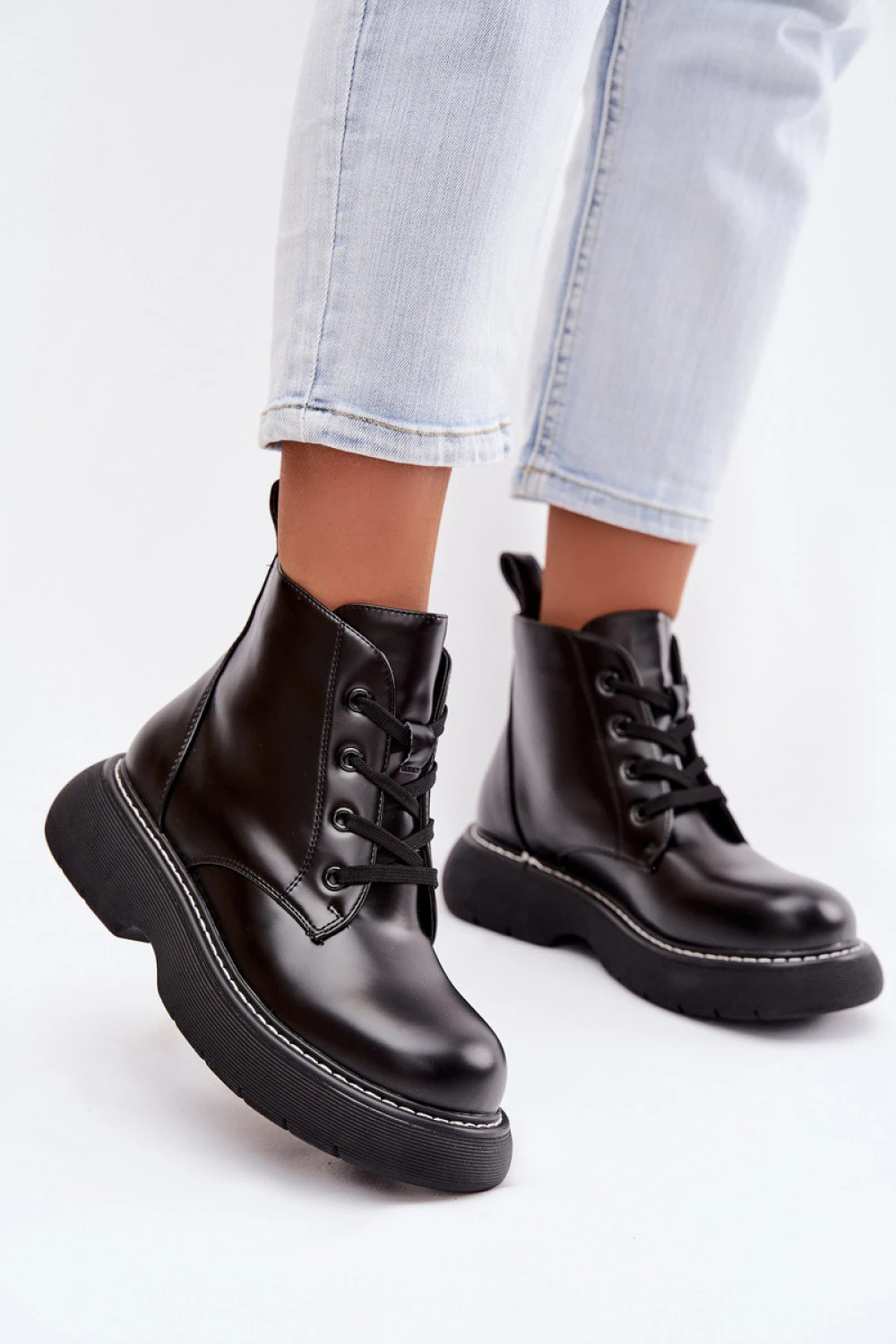 Dámské botky vyrobené z ekokože jsou praktickou a stylovou volbou na chladnější dny. Umístěné na stabilní platformě poskytují pohodlí a pohodlí, a nízký střih se skvěle hodí do každodenních stylizací. Klasické šněrování usnadňuje přizpůsobení se noze a vyztužená vložka zaručuje teplotu a pohodlí nošení. Jsou to univerzální botky, které skvěle doplní každodenní outfit.