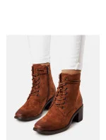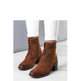 Hnědé botky Sanlow jsou ideální obuví na chladné podzimní dny. Mají standardní výšku podpatku a čtvercovou špičku, kolem kotníku jsou provázeny šněrováním, což jim dodává charakter. Jsou vyrobeny z ekokože semiše, mají vysokou štíhlou patu s bočním zipem a šněrováním vpředu. Čtvercová špička je lehce vyztužená polstrováním. Tyto pohodlné botky na podpatku se skvěle hodí do každodenních podzimních stylizací. Velikost je standardní, takže se vyplatí držet svou vlastní velikost. Navíc mají botky vyztužení, co zaručuje pohodlí a teplo během nošení. Podrážka je z umělého materiálu a je černá. Botky Sanlow jsou ideální volbou na podzim/zimu!