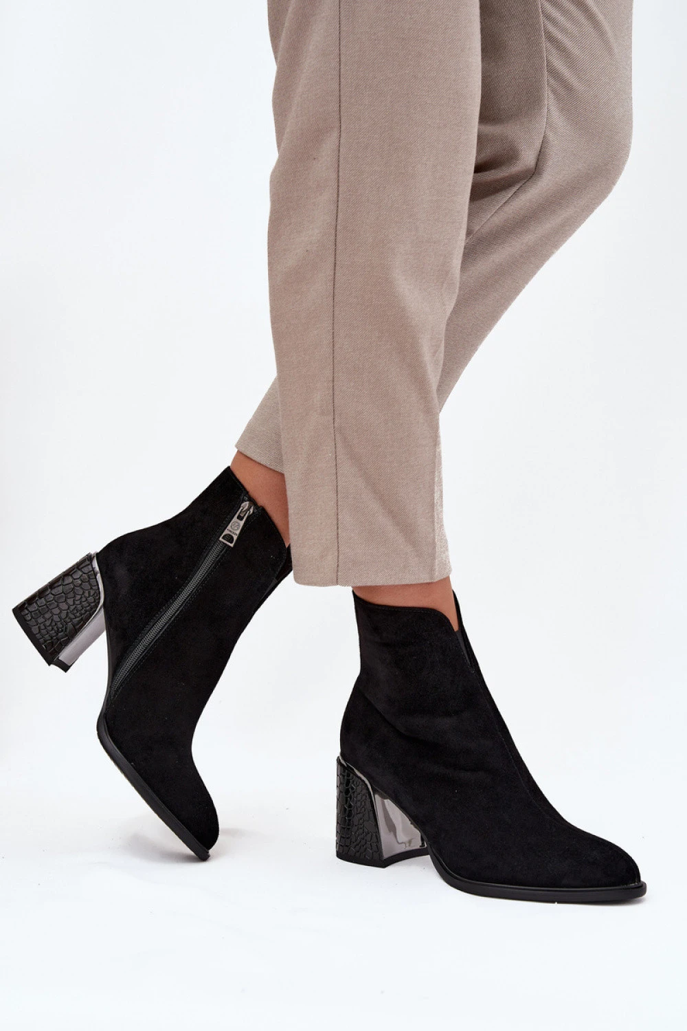 Botky pro ženy Vinceza vyrobené z přírodního semiše jsou kombinací elegance a moderního stylu. Umístěné na sloupkovém podpatku, který se vyznačuje decentním tiskem a zrcadlovým prvkem. Špičaté špičky zdůrazňují ženský vzhled, a zip usnadňuje rychlé obouvání. Vystlaný interiér poskytuje pohodlí a teplo v chladnějších dnech, což z nich činí ideální volbu na podzim a zimu.
