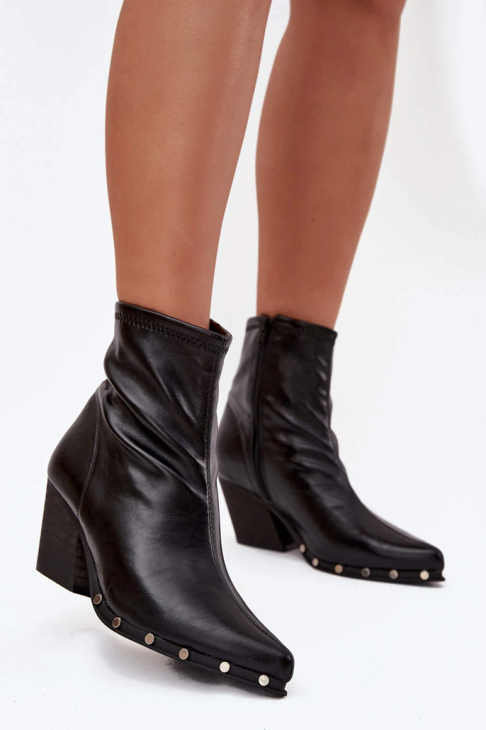 Kožené dámské cowboy boty vyrobené z ekologické kůže jsou ideální kombinací klasického střihu s moderním dokončením. Charakteristické špičaté špičky a sražený sloupcový podpatek jim dodávají západní charakter a zároveň krásně zjemňují postavu. Stabilní podpatek zajišťuje pohodlí při nošení, díky čemuž jsou boty vhodné na každodenní nošení. Model je uzavřen praktickým zipem, co usnadňuje obouvání a svlékání. Dekorativní hřebíky na podešvi jsou výrazným detail, který přitahuje pozornost a dodává celku trochu rockového nádechu. Jsou to jedinečné boty, které se skvěle hodí k džínům a kožichu, ale také k šatům, tvořící módní kontrastní vzhled.