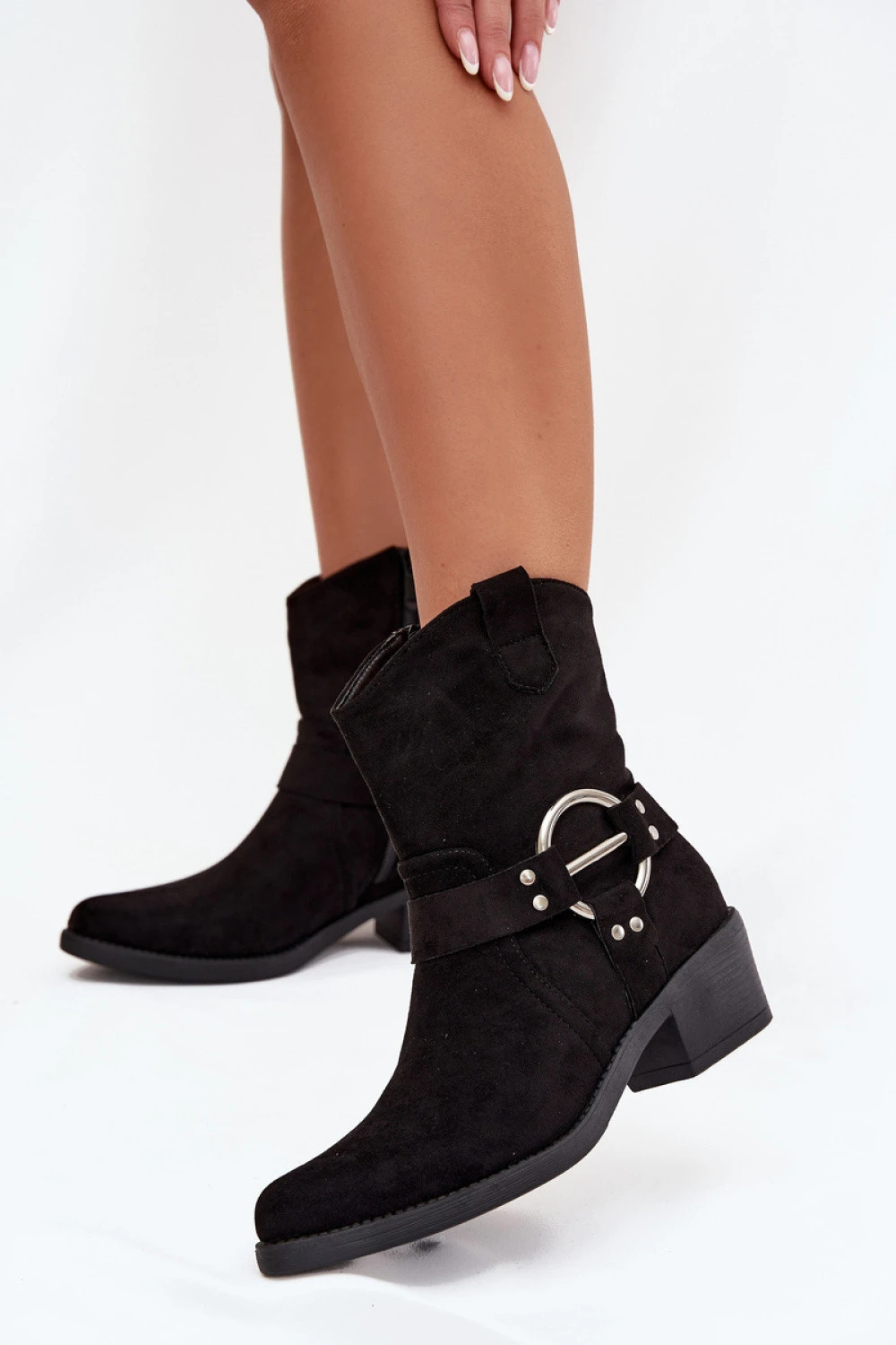 Botky cowboyky vyrobené z ekologického semiše jsou módní nabídkou na každý den. Díky nízké podpatku poskytují pohodlí a mandlové špičky dodávají subtilní eleganci. Pozornost přitahují dekorativní popruhy po stranách stonku zdobené stříbrným prvkem, které dávají celku charakteristický kovbojský styl. Jedná se o univerzální model, který se skvěle hodí do každodenních stylizací, dodávají jim módní akcent.