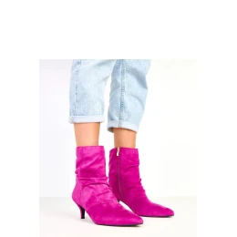 Elegantní dámské kotníkové botky vyrobené z jemné ekologické semišové kůže. Konečný špičatý špičák a 6centimetrový jehlový podpatek dodávají botkám ženský charakter a jemně zjemňují nohy. Model má 16,5cm vysoký svršek, který elegantně obepíná kotník a skvěle ladí jak s sukněmi, tak s kalhotami. Vnitřek je vybaven měkkou látkou, co zajišťuje pohodlí při nošení. Praktické zipové zapínání usnadňuje obouvání a svlékání bot a celkově je udržováno v elegantním střihu, ideálním na schůzky, slavnostní události nebo večerní vycházky.