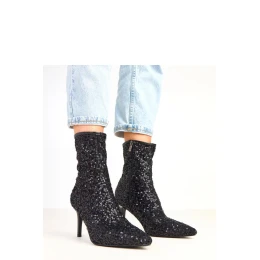 Oslnivající kotníkové botky pro dámy vyrobené z elegantní látky a pokryté flitrovým zpracováním po celé ploše, které krásně odráží světlo a přitahuje pohledy. Štíhlý špičatý nos a 8,5centimetrový jehlový podpatek jim dodávají výjimečnou lehkost a eleganci. Model s 18cm vysokým svrškem efektně zdůrazňuje kotník a praktické zapínání na zip usnadňuje obouvání. Vnitřek je vyroben z měkké látky, což zajišťuje pohodlí při nošení navzdory elegantní povaze obuvi. Jsou to boty určené na výjimečné příležitosti, skvělé k večerním kreacím, koktejlovým šatům nebo stylizacím, ve kterých se počítá s leskem a glamour.