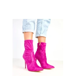 Elegantní kotníkové boty pro ženy vyrobené z měkké ekologické semišové kůže. Konečný špičatý nos a 11centimetrový podpatky ve tvaru špendlíku jim dodávají zvlášť ženský charakter a opticky prodlužují nohy. Model má 14,5 cm vysoký svršek, který jemně obepíná kotník a skvěle ladí jak s kalhotami, tak s elegantním šaty. Zapínání na zip zajišťuje pohodlné obouvání a vnitřek vyrobený z látky zaručuje pohodlí při nošení. Jsou to elegantní kotníkové boty ideální na speciální příležitosti, schůzky nebo večerní vycházky, perfektní volba pro ženy, které oceňují klasiku v moderním provedení.