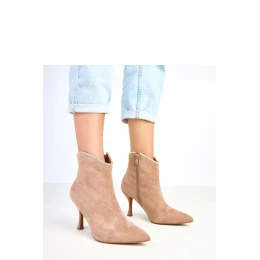 Elegantní dámské kotníkové boty vyrobené z měkké ekologické semišové kůže, které se vyznačují jemným, a zároveň efektním detailom, zdobením s cirkonii na horním okraji hole. Toto drobné ozdoby přidává botám eleganci a skvěle ladí s večerními styly. Model s 12 cm vysokou hole jemně obepíná kotník, špičatý nos a 8,5 cm sloupovým podpatkem krásně zjemňují postavu, zajišťují stabilitu a pohodlí. Praktické zapínání na zip usnadňuje obouvání, a vnitřek je vyroben z měkké látky bez podšívky, díky čemuž se boty skvěle osvědčují v přechodném období. To je ideální volba pro ženy, které ocení eleganci s nádechem lesku.