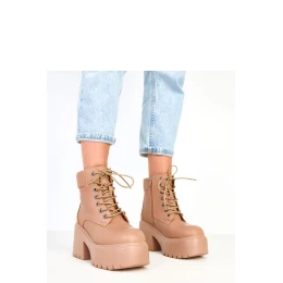 Moderní a výrazné masivní dámské botky vyrobené z odolné ekologické kůže. Model má charakteristický čtvercový špičák, 12centimetrový nárt a pevný 9centimetrový podpatek a 5centimetrovou platformu, co jim dodává silný, módní charakter a zajišťuje pohodlí při chůzi. Boty mají klasické šněrování doplněné praktickým zipem, který usnadňuje obutí. Vnitřek je vybaven textilií bez podšívky, díky čemuž jsou ideální na přechodné období. Jsou to botky ve stylu chunky, které dokonale doplní městské outfit, ideální k džínám, kožené bundě nebo oversized kabátu.