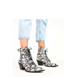 Elegantní dámské kotníčkové boty vyrobené z vysoce kvalitní ekologické kůže, které se vyznačují ozdobnými výřezy, šněrováním a efektními sponami, které jim dodávají jedinečný charakter. Stísněný špičatý nos a 7,5centimetrový sloupový podpatek opticky zjemňují postavu, zároveň zajišťují pohodlí a stabilitu. 14centimetrový svršek krásně zdůrazňuje kotník a vnitřek vybavený látkou zaručuje pohodlí při nošení. Bez podšívky jsou tyto botky skvělou volbou na přechodnou sezónu. Jsou to botky s moderním a elegantním designem, které dodají charakter jak každodenním, tak i výjimečným stylizacím.