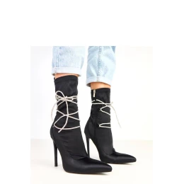 Výjimečné dámské botky vyrobené z elegantního saténu, které přitahují pozornost díky ozdobným šňůrkům zdobeným zirkony. Klenutý špičatý nos a štíhlý 12centimetrový podpatek dodávají celku smyslný a luxusní charakter. Model má 21centimetrový nárt, který krásně zdůrazňuje linii nohou, a praktické zapínání na zip zajišťuje pohodlné obouvání. Interiér je vybaven měkkou látkou bez dalšího vycpávání, což z nich činí ideální volbu na jarně-letní sezónu nebo elegantní události. Jsou to efektní a lesklé botky, které skvěle doplní večerní outfit, dodají jim eleganci a oslnivý charakter.