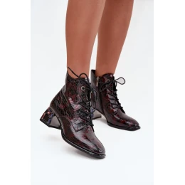 Botky značky Artiker vyrobené z lakované přírodní kůže jsou elegantní obuv s nádechem originality. Umístěné na stabilním podpatku typu blok, zdobeném krystalky, přitahují pozornost a dodávají stylizacím jedinečný charakter. Model kombinuje šněrování s praktickým zipem, co usnadňuje obouvání a přizpůsobení se noze. Zaoblené špičky zdůrazňují klasický střih, a vnitřek vyhřátý měkkým kožichem zaručuje pohodlí a teplo v chladnějších dnech.