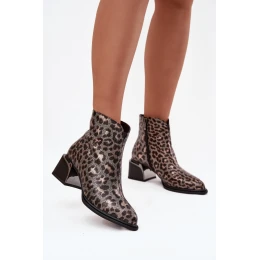 Stylové a elegantní dámské botky vyrobené z přírodní kůže jsou návrhem, který spojuje módní vzhled s pohodlím nošení. Model se vyznačuje efektním vzorem v panteru, který dodává výrazný charakter a zdůrazňuje ženský styl. Umístěné na stabilním podpatku ve tvaru bloku zajišťují pohodlí při nošení, a praktické zapínání na zip usnadňuje obouvání a svlékání. Mandlové špičky dodávají celku jemnou eleganci, a dekorativní prošívání běžící podél svršku opticky prodlužuje nohu a zdůrazňuje štíhlou linii boty. Vystřižené vnitřní zateplení zaručuje teplo v chladnějších dnech, díky čemuž se botky skvěle osvědčí v podzimně-zimní sezóně. Jedná se o model, který bude ideálním doplňkem jak pro každodenní, tak pro více elegantní stylingy.