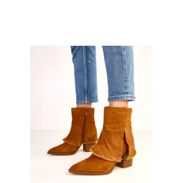 Elegantní kotníkové boty s otočeným límcem, které spojují eleganci s moderním detail. Vyrobena z vysoce kvalitního zamszového ekologického kůže, působí efektně a jsou ideální volbou na chladnější dny. Model má špičatý nos, který opticky zjemňuje nohu, a podpatek výšky 9 cm zajistí stabilitu a pohodlí při chůzi. Otočený límec dodává botám charakter a módní akcent, a zip umožňuje rychlé obutí. Díky podšívce a textilní vložce boty zaručují teplo a pohodlí po celý den. Límec výšky 13 cm krásně obklopuje kotník, vytvářejíc moderní a elegantní vzhled.