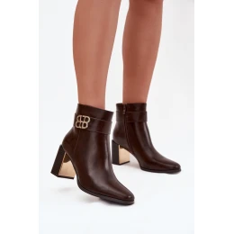 Botky pro dámy vyrobené z ekologické kůže. Model je umístěn na stabilním sloupkovém podpatku, zdobený zlatým zrcadlovým prvkem, který dodává celku výjimečný charakter. Boty se zapínají na zip, co zaručuje pohodlí při obouvání a ideální přizpůsobení. Na horní části boty je ozdobný detail s páskem, který představuje decentní, stylový akcent. Jedná se o univerzální botky, které se skvěle hodí jak do elegantních, tak každodenních stylizací.