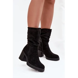 Boty pro ženy vyrobené z ekologického semiše. Model je zdoben zvrásněným svrškem, který dodává módní charakter. Vložený střih s dalším zipem zajišťuje pohodlí při obouvání. Boty jsou umístěny na stabilním sloupkovém podpatku, co zaručuje pohodlí při chůzi a jemně zeštíhlí postavu. Vnitřek je vyztužen pěnou potaženou látkou, co zajišťuje teplé nohy v chladnějších dnech. To je skvělá volba na podzimní a zimní sezónu, univerzální botky, které se hodí jak do každodenních, tak do elegantních stylizací.