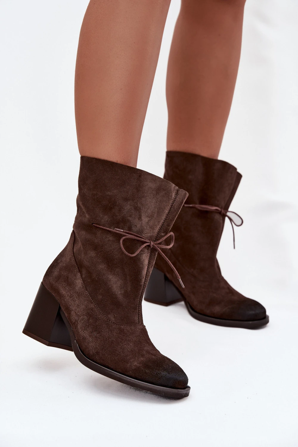 Dámské botky vyrobené z přírodního semiše jsou elegantní nabídkou pro ženy, které ocení styl a pohodlí. Model se nasazuje moderně a podpatek ve formě stabilního sloupku dodává postavě lehkost a zajišťuje pohodlí nošení. Na svršku je jemná šňůrka, která umožňuje přizpůsobit botky noze a decentně zdůrazňuje jejich ženský charakter. Jedná se o univerzální model, který se skvěle hodí jak do každodenního, tak do elegantnějšího stylu.