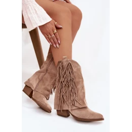 Kovbojské boty vyrobené z ekosuede jsou stylovým modelem inspirovaným westernovou atmosférou. Charakteristické franže dodávají lehkost a efektní pohyb, zkrácený sloupkový podpatek a špičaté špičky zdůrazňují jejich výjimečný střih. Zapínání na zip usnadňuje oblékání, a polštářek pokrytý měkkým materiálem poskytuje pohodlí a teplo v chladnějších dnech.