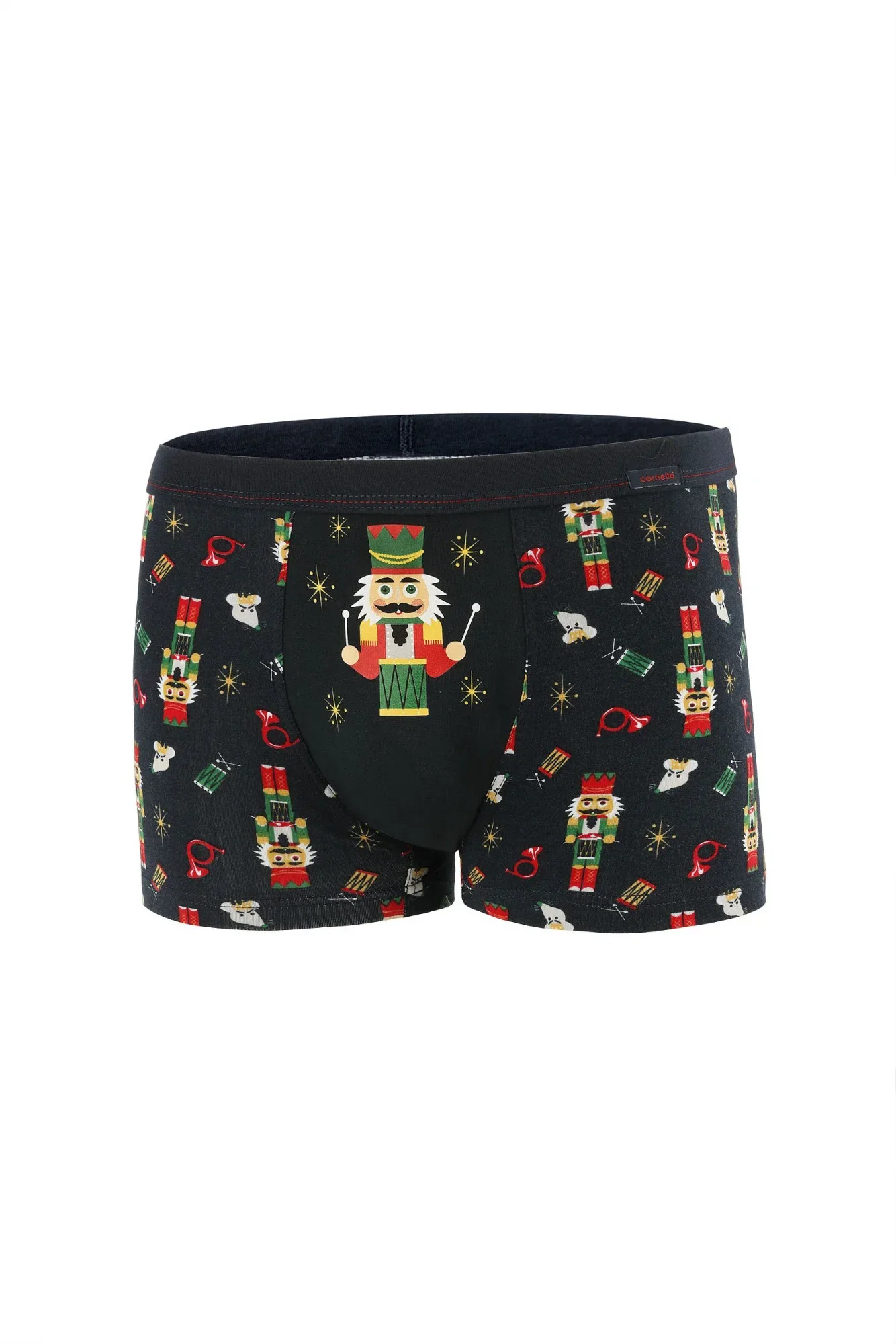 Pánské tmavě modré boxerky zdobené slavnostním motivem, ideální jako dárek. Sportovní, přiléhavý střih. Měkký, pružný bavlněný úplet vysoké kvality. V tunýlku krytá guma. Polská, známá značka Cornette. Výrobek balený v krabičce. Složení: 95 % bavlna, 5 % elastan.