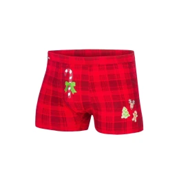 Fenomenální červené pánské boxerky ve světle kostkovaném vzoru, zdobené vánočním lízátkem uprostřed a převázané elegantní zelenou mašlí - veselá interpretace pánského spodního prádla Merry Christmas od značky Cornette, zabalená v dárkové krabičce pro něj. 95 % bavlna, 5 % elastan.
