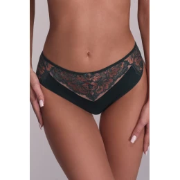 Figi brazyliany AV 2174 Azure to niezwykle kobieca propozycja, która łączy zmysłowy design z komfortem noszenia. Wykonane z miękkiej mikrofibry i efektownej dwukolorowej koronki w odcieniach głębokiej zieleni i miedzianej miedzi, prezentują się wyjątkowo elegancko. Przód zdobi trójkątna wstawka z tiulu pokryta florystycznym haftem, subtelnie podkreślając linię talii.